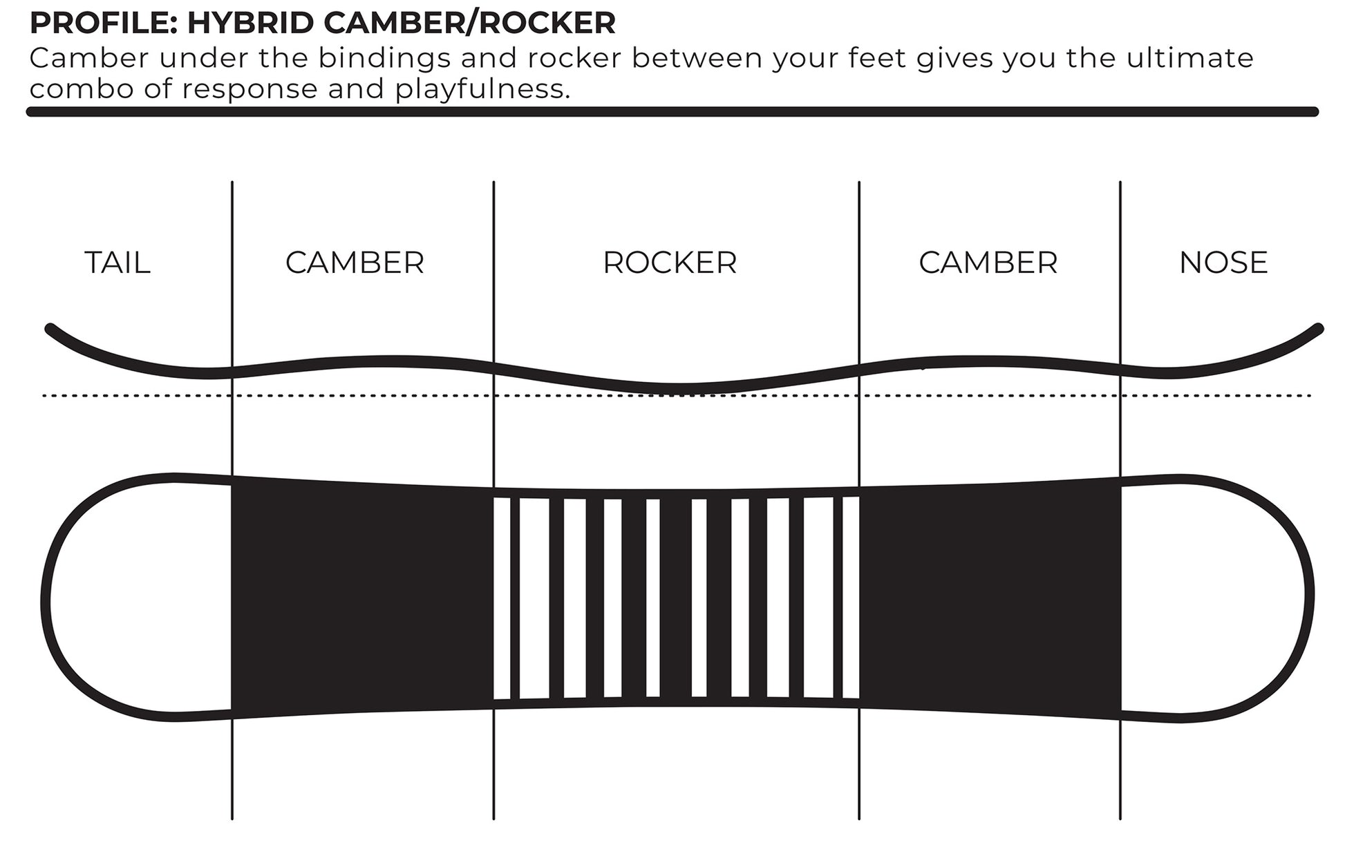 Board Profile: Flat Rocker - A long flat middle section with early rise in the nose and tail makes for a stable catch free ride